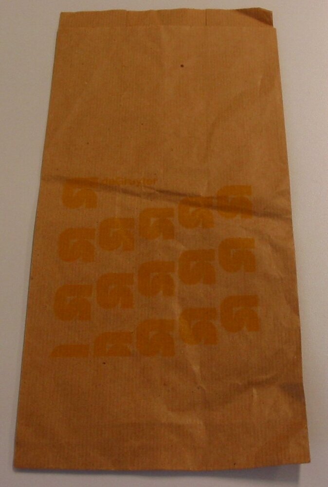 - BeschrijvingBruine papieren zak met op voor- en achterzijde geel opschrift en logo's van De Gruyter. Er staan op beide zijden 16 logo's afgebeeld.