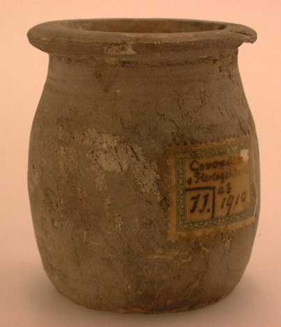 - BeschrijvingPotje, van buiten geel verglaasd, ovaal van vorm met platte ribbel om de mond (oude kaart) - platte bodem, geen voet - enigszins bol lichaam met draaigroeven - insnoering onder de platte bindrand - buitenkant ongegalzuurd - binnenkant voorzien van geel loodglazuur