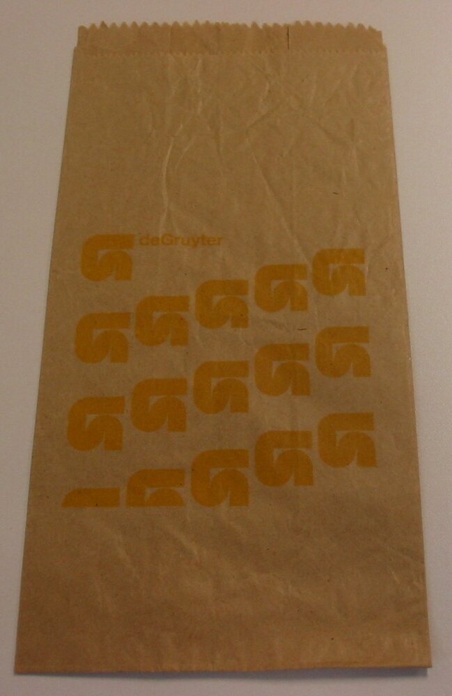 - BeschrijvingBruin papieren zakje met op voor- en achterzijde geel opschrift en logo's van De Gruyter. Er staan op beide zijden 16 logo's afgebeeld.