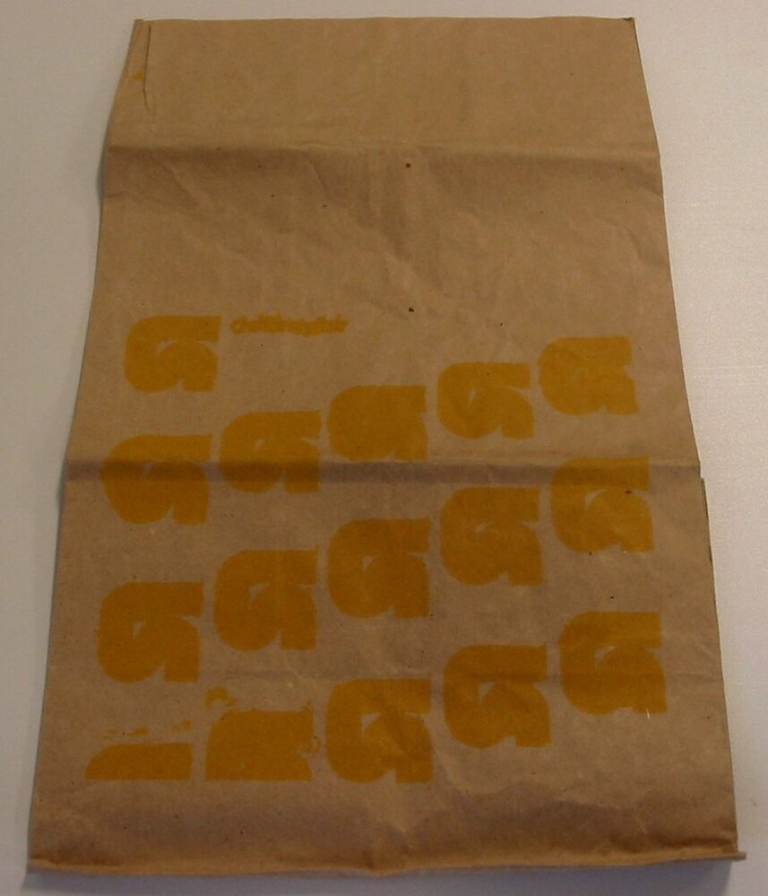 - BeschrijvingBruin papieren zakje met op voor- en achterzijde geel opschrift en logo's van De Gruyter. Er staan op beide zijden 16 logo's afgebeeld.