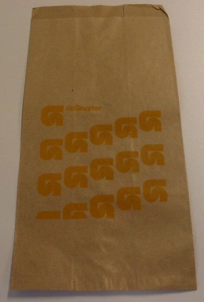 - BeschrijvingBruin papieren zakje met op voor- en achterzijde geel opschrift en logo's van De Gruyter. Er staan op beide zijden 16 logo's afgebeeld.