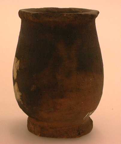 - BeschrijvingPotje van rode aarde, van binnen verglaasd (oude kaart) - naar onderen uitlopend voetje, kleiner dan het lichaam, met ongelijke bodem - ovaalvormig lichaam - insnoering onder bindrand - dun zwart geglazuurd, aan de binnenkant grotendeels afgesleten, witte vlekken op de buik