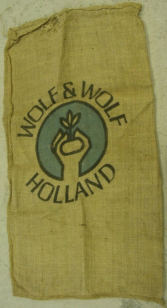 Bruine jutezak met blauw en zwarte opdruk. In midden rond figuur met hand en plantje.
