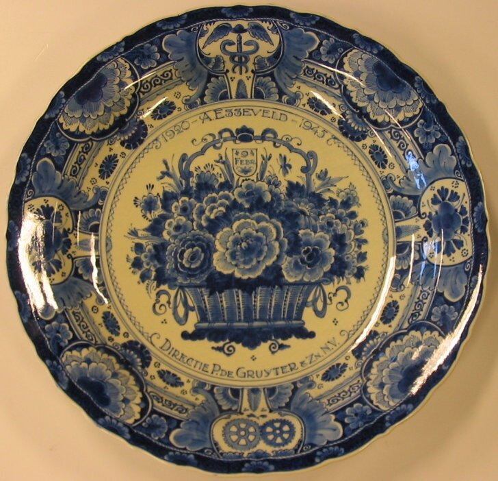 Delftsblauw gedenkbord van het 25-jarig dienstjubileum van A. Essveld. Hij werkte bij de Gruyter van 1920 tot en met 1945. Dit staat bovenaan het bord, samen met zijn naam. In het midden is een mand met bloemen afgebeeld met daarin de datum 9 februari. Onder de mand staat 'Directie P. de Gruyter & Zn .N.V. Het bord heeft een opstaande rand met daarop afgebeeld allerlei bloemen, bloempatronen en boven een soort esculaap-teken met twee slangen en onder twee tandwielen. Aan de achterzijde van het bord zit een ophanghaakje. Bij de Gruyter was het waarschijnlijk gebruikelijk om bij een jubileum een bord aan iemand te geven, want we hebben nog eenzelfde bord van het jubileum van Lodewijk de Gruyter. Achterop het bord zat een briefje geplakt, waarop stond: bruikleen familie Esseveld Zaltbommel. waarschijnlijk is dit een notitie van een ander museum.