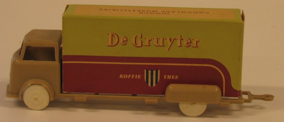 - BeschrijvingSpeelgoed vrachtwagen van De Gruyter. Bestaande uit een plastic onderstel met witte wielen met daarop een kartonnen doosje waar ooit chocolade musketflikjes in hebben gezeten. Het doosje is groen en rood van kleur.