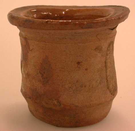 Potje, lichtrood, van binnen bruin geglazuurd (oude kaart) - vlakke bodem - ronde insnoering bij voet - iets teruglopend lichaam met draairingen - mondrand gemarkeerd door ribbel en groef, uitstaand,horizontaal, niet volledig rond - oranjebruin loodglazuur, de binnenkant geheel, de buitenkant hier en daar bedekkend - witte vlekjes aan de buitenkant