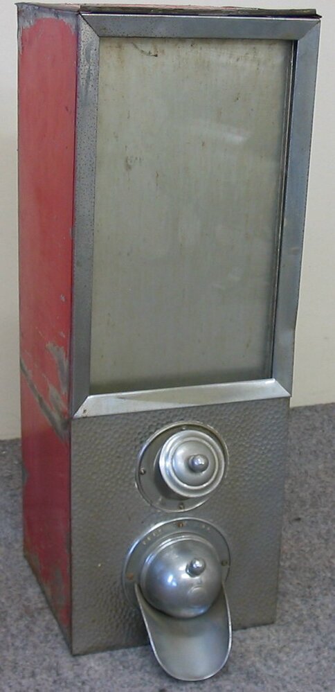 - BeschrijvingRode metalen koffiesilo uit een winkel van De Gruyter. Aan de voorzijde steekt een losse schep in de silo. Onder de schep zit een draaiknop waarmee je de koffiebonen eruit kunt halen. De voorzijde van de silo is zilverkleurig en de rest is rood geverfd.