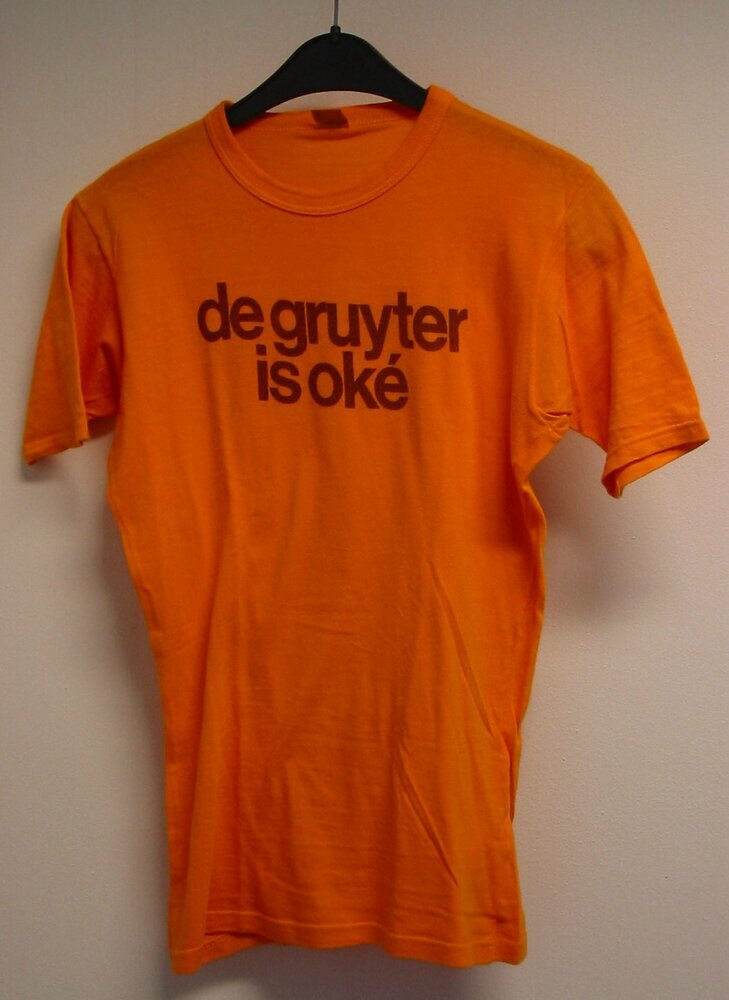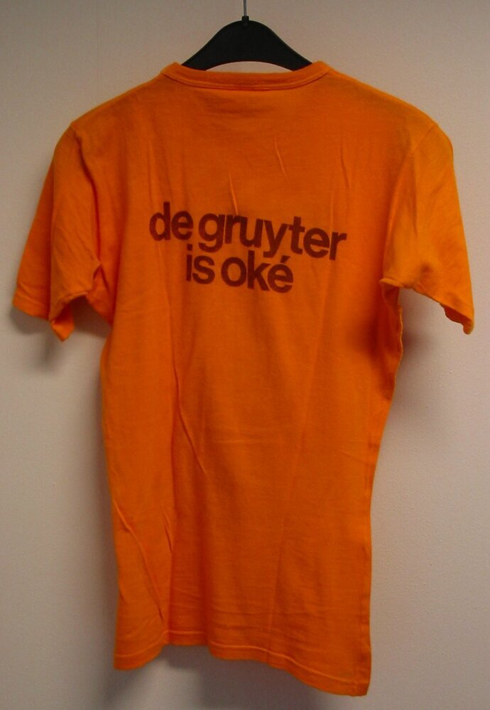 - BeschrijvingOranje-geel t-shirt met de tekst "de gruyter is oké". De tekst staat op de voor-en achterzijde. Het t-shirt heeft een ronde hals en korte mouwen.