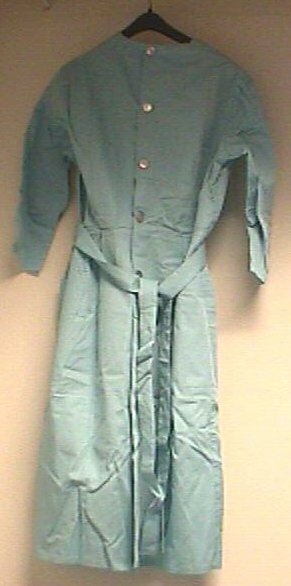 - BeschrijvingBlauwe jurk met ceintuur, twee zakken en sluiting met 5 knopen aan achterzijde. Waarschijnlijk gebruikt in winkel of fabriek van De Gruyter.