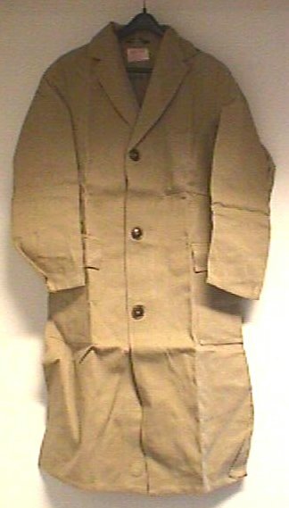 Lange bruine jas gebruikt in fabriek van De Gruyter. Op voorzijde zitten twee zakken.