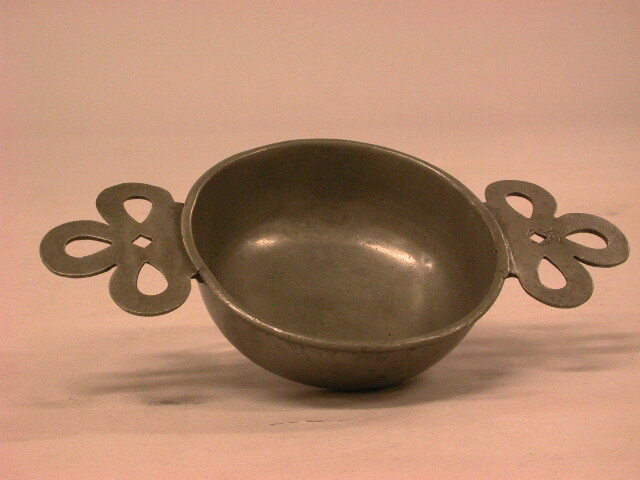 Tinnen pap- of brandewijnkom: een eenvoudig rond kommetje met twee aangesoldeerde oren (driepas- of krakeling oren), die opengezaagd zijn. In het ene oor staat het gietersmerk geslagen, het andere oor toont zowel aan boven- als aan onderzijde de ingekraste initialen IB.