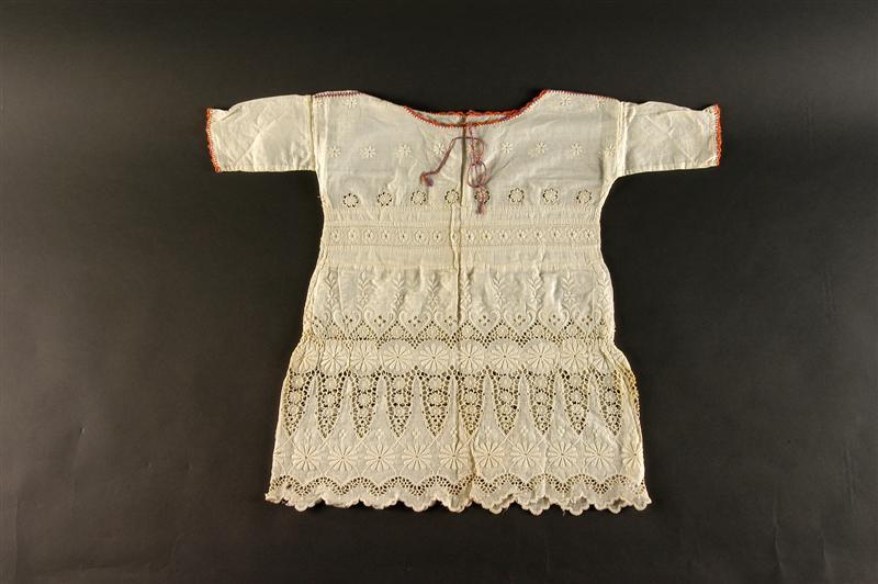 - BeschrijvingWit kinderjurkje van gebloemd kant. Langs de schoudernaad en de hals en langs de beide mouwtjes is een gefestonneerd randje van oranje met blauw katoen. Langs de hals zijn lusjes bevestigd waardoor een oranje met blauw touwtje is geregen.
