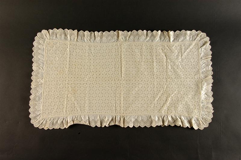 - BeschrijvingEen rechthoekig, wit geboortekleed van kant afgezet met een geplooide rand van broderiekant. Het kant in het midden heeft een fijn patroon van lelies. De rand heeft een bloem- en vakjespatroon.