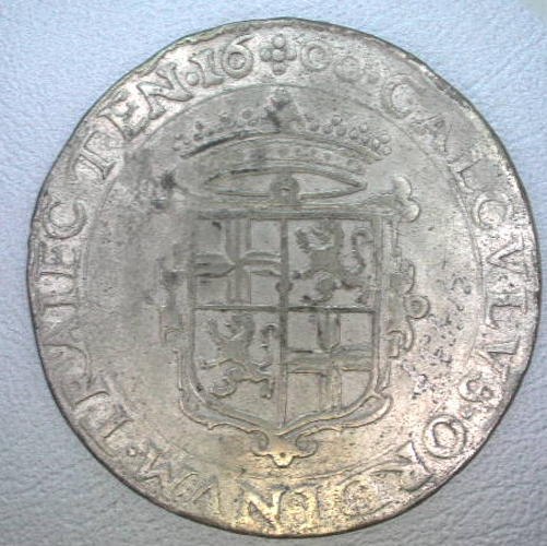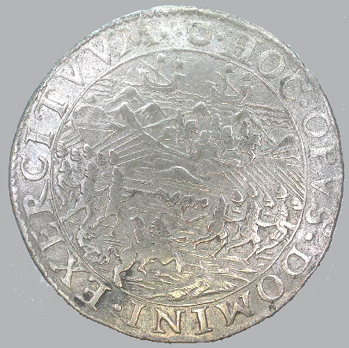 Vz: Binnen een getrokken rand een voorstelling van ruiters die voetvolk achtervolgen. Op de achtergrond twee schepen op zee. Tussen de getrokken rand en een parelrand het omschrift. Kz: Binnen een getrokken rand het gekroonde wapen van de provincie Utrecht. Op de met rolwerk versierd schild. Tussen de getrokken rand en een parelrand het omschrift