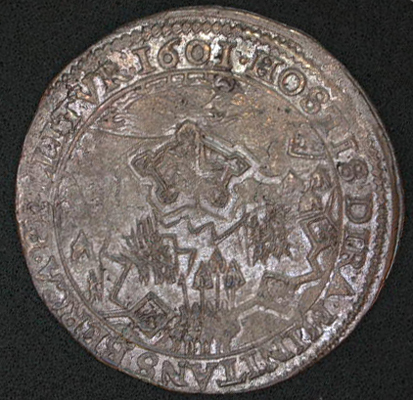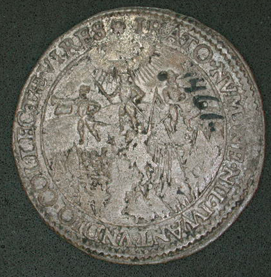 Vz: Binnen een dubbele getrokken rand een voorstelling van de belegering van Rijnbek. Tussen de dubbele rand en een parelrand het omschrift. Kz: Binnen een dubbele getrokken rand een voorstelling van de Graaf van Berg voor zijn troepen, terwijl uit de hemel stralen naar beneden komen. Tussen de dubbele rand en een parelrand het omschrift.