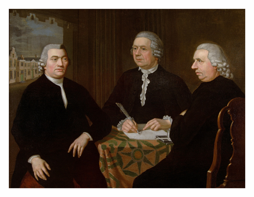 Voorgesteld zijn de regenten Michiel Loutermans, Gerard Smits en Jan Godfridus Heeren. Zij waren de eerste regenten van het Roomsch Armen Weeshuis te 's-Hertogenbosch, dat links op de achtergrond zelf is afgebeeld. Het weeshuis vond in 1778 een onderkomen in het Hof van Zevenbergen in de Keizerstraat.