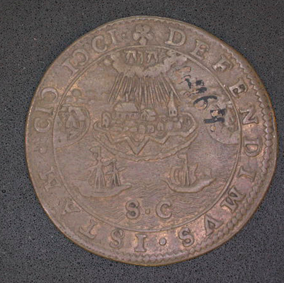 - BeschrijvingVz: Binnen een getrokken rand een afbeelding v.d. belegering van Rijnbek. Binnen een getrokken rand en een parelrand het omschrift. Kz: Binnen een getrokken rand een gezicht op Oostende middenonder S.C. Tussen de getrokken rand en een parelrand het omschrift.