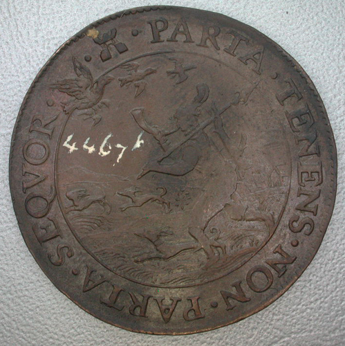 Vz: Binnen een getrokken rand een jager op hazenjacht met een gevangen haas op de rug. In de lucht roofvogels. Tussen de getrokken rand en een parelrand het omschrift. Kz: Binnen een lauwerkrans het gekroonde wapen van Zeeland en het omschrift 16-02-CALC.CAM.RAT.ZEL. (rekenpenning van de rekenkamer van Zeeland). Tussen de lauwerkrans en een parelrand een tweede omschrift.