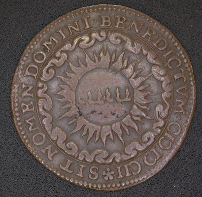 - BeschrijvingVz: Binnen een getrokken rand het woord "Jehova" (in het Hebreeuws) in een stralende zon. Tussen de getrokken rand en een parelrand het omschrift. Kz: In het door een parelrand omgeven veld het opschrift HOS./TROVOC.POST./TVMVLT.GRAV./CAP.TRIRE.DEPRESS./ET.SVBMERS.VIII,EQ.TVRM.CAES./AGR.LVX.VAST/SEN.FOE.PP/F.F.