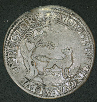 - BeschrijvingVz: Binnen een getrokken rand een afbeelding van de fabel van Aesopus waarin een vos een haan uit een boom lokt. Tussen de getrokken rand en een parelrand het omschrift. Kz: Binnen een getrokken rand de plattegrond van Oostende. Tussen de getrokken rand en een parelrand het omschrift.