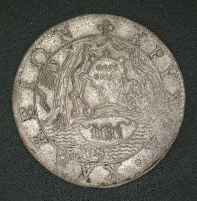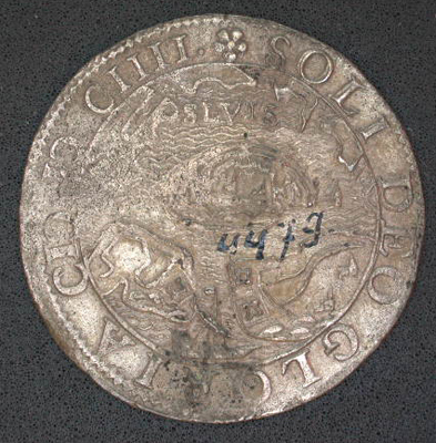 - BeschrijvingVz: Binnen een getrokken rand van een vogelvlucht plattegrond van Sluis middenboven: SLVIS. Tussen de getrokken rand en een parelrand het omschrift. Kz: Binnen een getrokken rand een plattegrond van Oostende. Tussen een getrokken rand en een parelrand het omschrift.