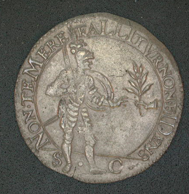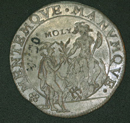 Vz: Mercurius geef Odysseus een kruid ter bescherming tegen de verlokkingen van Circe. Onder de "Moly" voorstelling een blanco afsnede rond de voorstelling het omschrift. Kz: Binnen een getrokken rand een geharnaste Nederlander die een vredestak aangereikt krijgt. Tussen de getrokken rand en een parelrand het omschrift