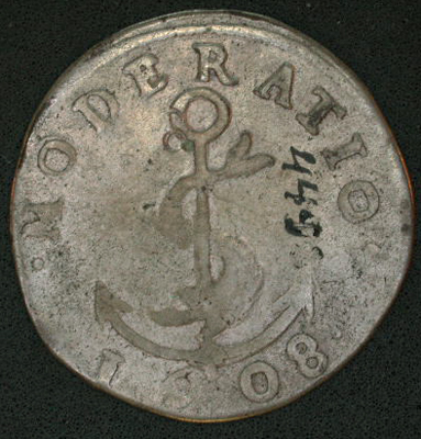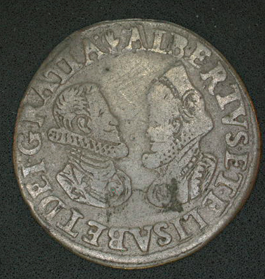 - BeschrijvingVz: Binnen een getrokken rand de naar elkaar toegewende borstbeelden van Albertus en Isabella. Tussen de getrokken rand en een parelrand het omschrift. Kz: Een anker waaromheen een dolfijn kronkelt. Om het geheel een parelrand.
