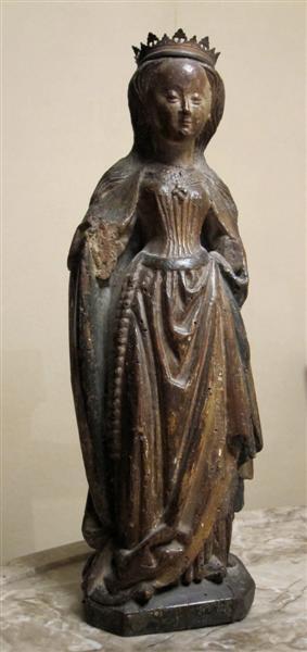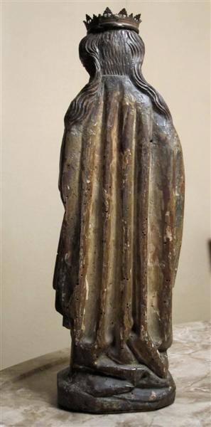 Staande figuur. De heilige houdt onder haar gebogen en naar voren gerichte onderarm het bovenkleed geklemd. Dit veroorzaakt een patroon van gebogen, lang uitzakkende plooien. Op haar hoofd breed bij de slapen uitstaande golvende haren en een kroon. Dit is niet de oorspronkelijke kroon. Een hoog voorhoofd, geloken ogen en een lichte glimlach.