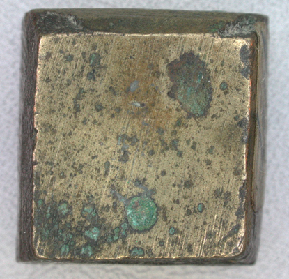 - BeschrijvingVierkant gewichtje in lage broodjesvorm, 0,3 x 1,3 x 1,5 cm, ca. 5 à 10 gram, met aan de ene zijde een krukkenkruis in een vierpas, omgeven door een parelrand (= Portugese Gouden Crusado). Aan de andere zijde een getordeerd zwaard (?) met de letters GDN en het jaartal 1623, het geheel omgeven door een lauwerkrans (=Guilliam de Neve, goudgewichtmaker A'dam)