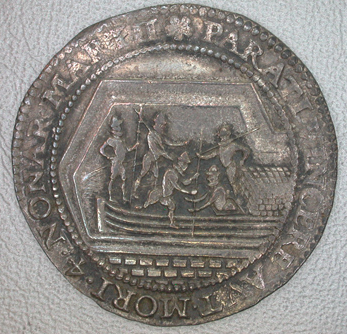- BeschrijvingVoorzijde: soldaten die uit het turfschip komen binnen een parelrand en een omschrift. Keerzijde: lauwerkrans en daarbinnen een opschrift.