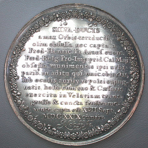 Keerzijde: binnen een bloemenkrans een opschrift in het Latijn, waarin melding wordt gemaakt van de inname van Den Bosch door Frederik Hendrik.