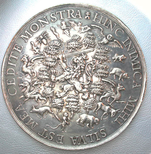 Voorzijde: de Nederlandse leeuw verdrijft gedrochten uit een bos (Den Bosch) en omschrift.