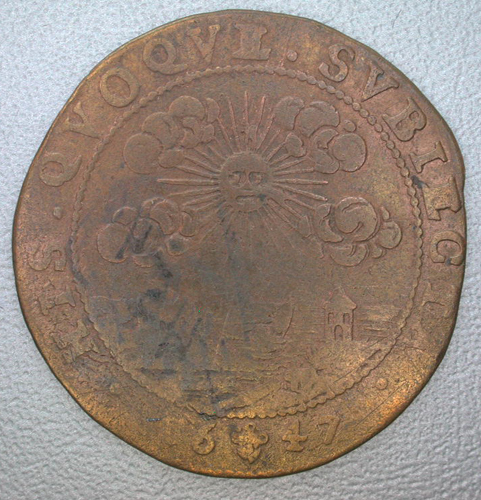 - BeschrijvingVz:binnen een parelrand het gekroonde wapen van Spanje, omhangen met een Gulden Vliesketen; omschrift: .PHIL.IIII.D.G.HISP.-.Et.INDIAR.REX.Zc. Kz:binnen een parelrand een zon tussen de wolken boven een haven; omschrift: HIS.QVOQVE.SVBIEC¬TA/16 kopje 47