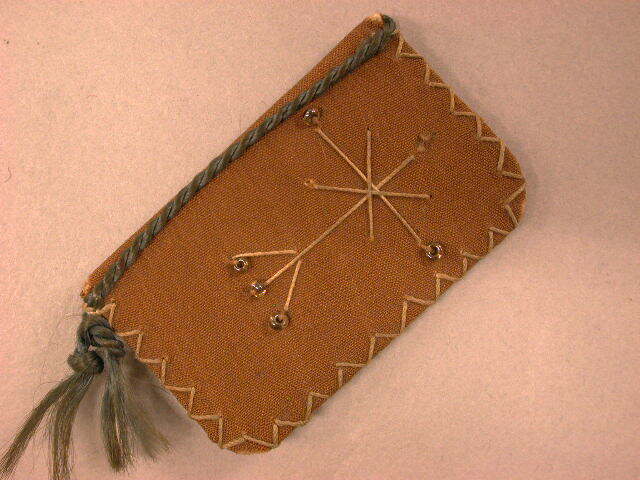 Omhulsel in de vorm van een boek met boekenlegger van lichtbruine stof, met wit en blauw garen.