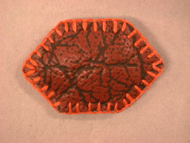 Zeshoekig omhulsel. Lichtblauw (voorzijde) en rood (achterzijde) plastic met lichtrode garen gefestonneerd.
