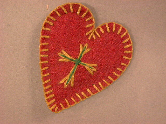 Agnus Dei met hartvormig omhulsel gemaakt van rode stof, groen garen en in het midden een kruis.