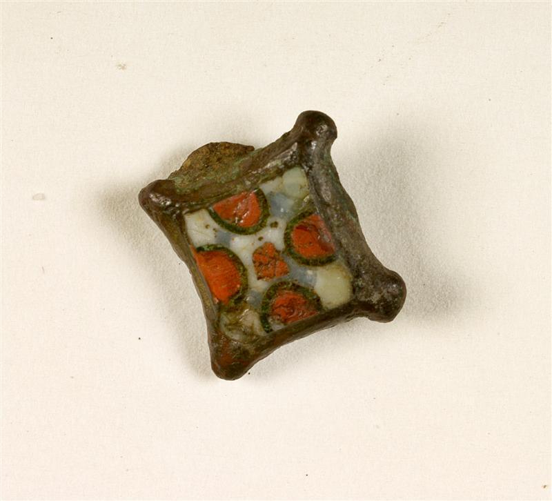 - BeschrijvingVierkante fibula versierd met een Maltezer kruis in rood en wit.