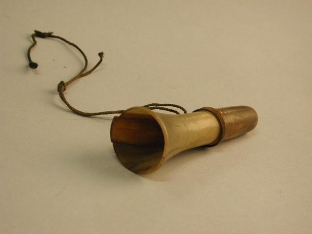 Eendefluitje met smal mondstuk en uitlopende tuit. Aan het fluitje een koordje.