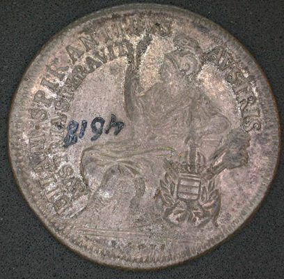 - BeschrijvingVz: Borstbeeld van Karel II van Spanje naar rechts Daaromheen het omschrift. Kz: Zittende soldaat met twee palmtakken in de ene en het wapen van Oostenrijk in de andere hand. Voor hem het opschrift AVSTRA SPERAVIT. In de afsnede de signatuur van de medailleur. Om het geheel het omschrift.