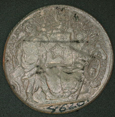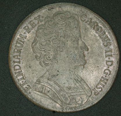 - BeschrijvingVz: Borstbeeld van Karel II van Spanje naar rechts Daaromheen het omschrift. Kz: Staande Mars en zittende Pallas Athene met een tekening van een vijfhoekige vesting tussen zich in. Naast Athene een schild met afbeeldingen van een passer, een winkelhaak en een globe. Boven de voorstelling een tweeregelig opschrift.