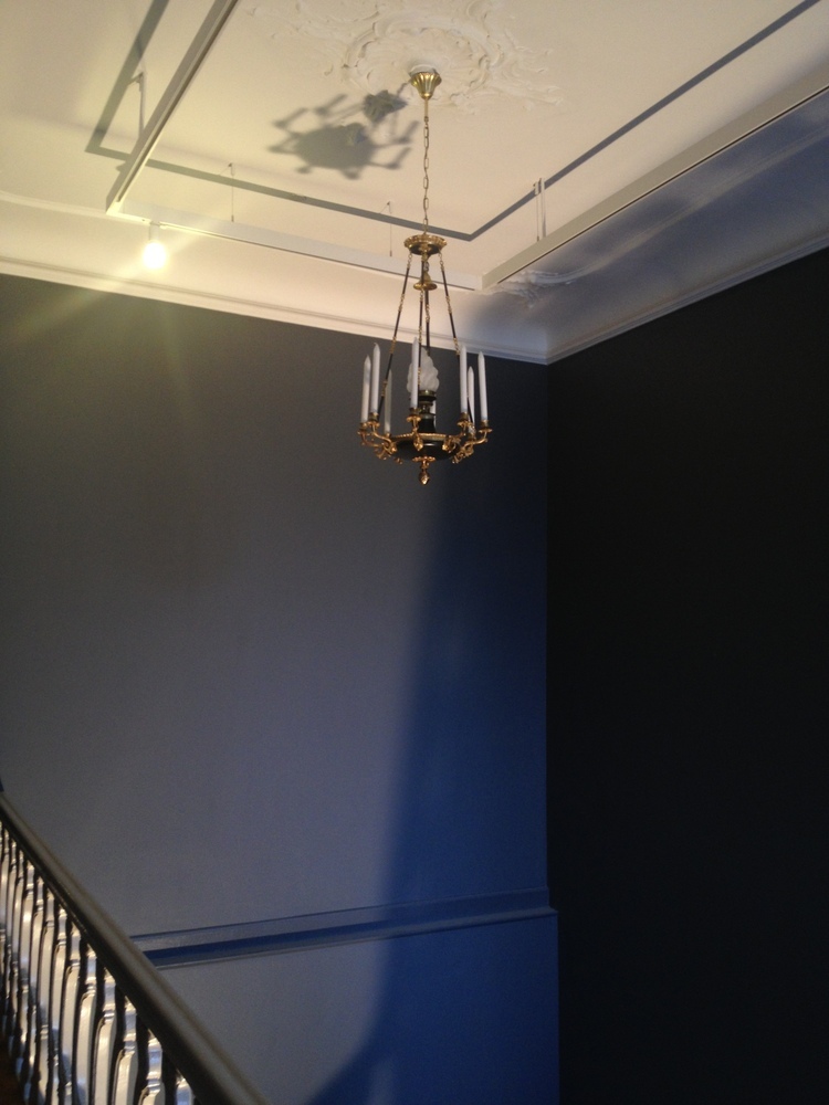 - BeschrijvingBronzen lichtkroon met acht armen en een glazen kap.