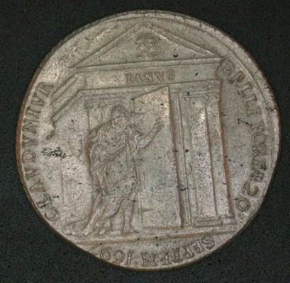 Vz:De keurvorst van Beieren sluit de deur van de Janustempel. Daaromheen het omschrift. Kz:De Spaanse en de Beierse leeuw, elk met een poot rustend op hun respectievelijke wapenschild,trekken een zegelkar. Waarin de Vrede is gezeten. Blanco afsnede. Boven de voorstelling een opschrift. De Janustempel op het forum Romanum te Rome had de vorm van een poortdoorgang. Deze poort mocht slechts gesloten worden wanneer in het gehele Romeinse rijk vrede heerste.