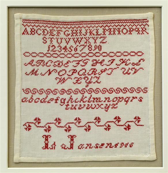 Verzameling proeflapjes e.d., gebundeld in een album met cassette: letterlap van L. Jansen