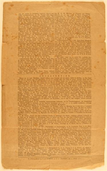 - BeschrijvingEen lang vel papier, bedrukt aan zowel de voor- als keerzijde. Op de voorzijde is de tekst in twee kolommen verdeeld. Op de keerzijde is de gehele breedte van de pagina gebruikt.