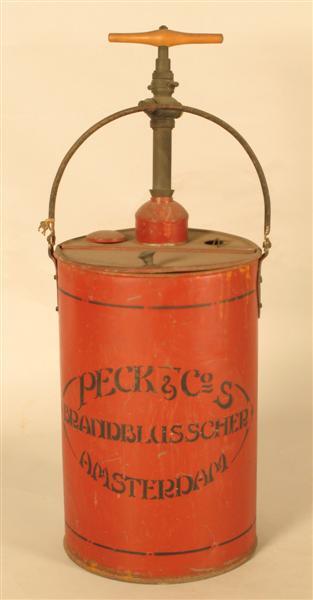 - BeschrijvingIJzeren gesloten rood rond vat met koperen pomp met houten handvat en slang op bovenzijde. Op de wand een tekst.