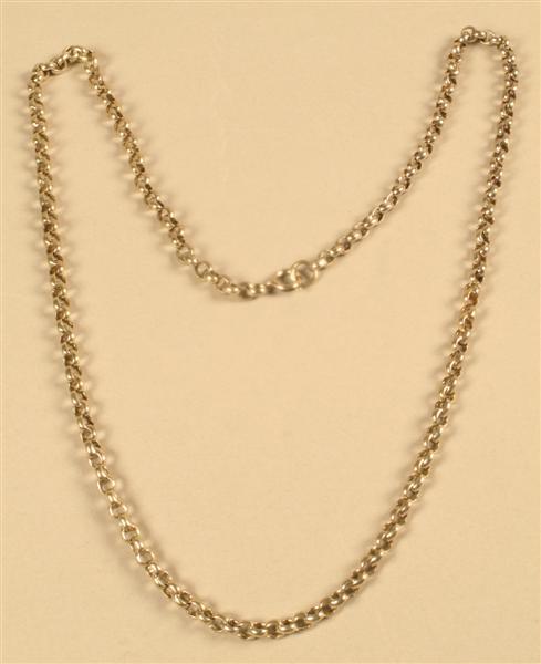 - BeschrijvingDeze ketting maakt deel uit van een chatelaine, een riem of ketting waaraan allerlei voorwerpen werden gehangen. In dit geval betreft het een chatelaine met naai- en borduurgerei.