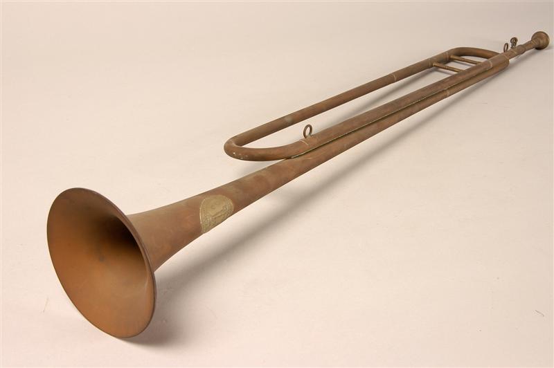 - BeschrijvingBazuin met een winding en los inschuifbaar mondstuk dat met een kettinkje aan de buis vastzit. Op de beker een metalen plaatje met een trompettist, tussen 5 engeltjes en staande op een wereldbol. Boven hem: SOLIST en WETTING GEDEPONEERD. Onder hem: "J. Ansing & Co. Zwolle"