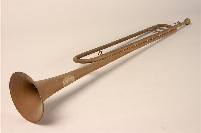 - BeschrijvingBazuin met een winding en los inschuifbaar mondstuk dat met een kettinkje aan de buis vastzit. Op de beker een metalen plaatje met een trompettist, tussen 5 engeltjes en staande op een wereldbol. Boven hem: SOLIST en WETTING GEDEPONEERD. Onder hem: "J. Ansing & Co. Zwolle"