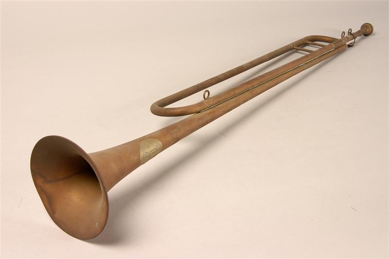 - BeschrijvingBazuin met een winding en los inschuifbaar mondstuk dat met een kettinkje aan de buis vastzit. Op de beker een metalen plaatje met een trompettist, tussen 5 engeltjes en staande op een wereldbol. Boven hem: SOLIST en WETTING GEDEPONEERD. Onder hem: "J. Ansing & Co. Zwolle"