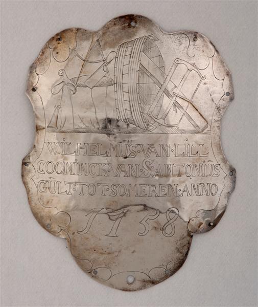 Schild met afbeelding met kuipersgereedschappen waaronder een zaag, passer, hamer. Daaronder opschrift: "WILHELMUS. VAN. LILL/ COONINCK. VAN. S: ANTONIUS GULT. TOT. SOMEREN. ANNO/ 1758" Schild heeft onregelmatige contouren rondom zijn langs de rand gaatjes aangebracht, waarmee schild op vest vastgezet kan worden.